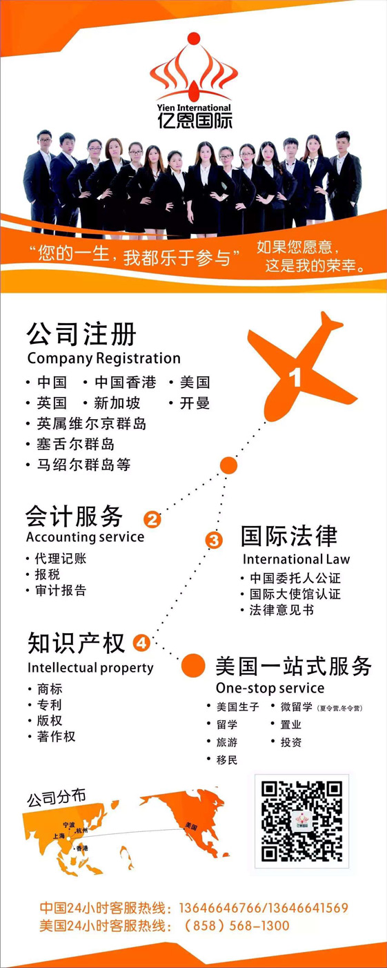 億恩國(guó)際顧問(wèn)有限公司專(zhuān)業(yè)代理注冊(cè)香港、英國(guó)、美國(guó)、新加坡、英屬維爾京(BVI)群島、馬紹爾群島等海外公司;專(zhuān)業(yè)代理中國(guó)及海外知識(shí)產(chǎn)權(quán):商標(biāo)、專(zhuān)利,版權(quán)、海關(guān)備案等服務(wù)。我們擁有多年的實(shí)際操作經(jīng)驗(yàn)、專(zhuān)業(yè)過(guò)硬。我們具有充分的條件為客戶的各種需求提供多元化全面的商業(yè)及進(jìn)出口、銀行等咨詢服務(wù)。