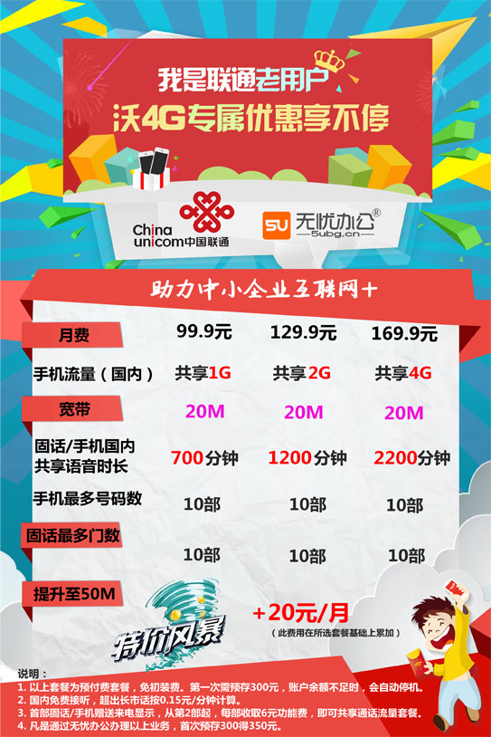 中國聯(lián)通•智慧沃企,是一款為商鋪、企業(yè)通信量身定做的產(chǎn)品,十分適合中小型企業(yè),寬帶可提升至50M,套餐內(nèi)固話/手機(jī)共享語音和流量,價(jià)格優(yōu)惠,通信便捷,服務(wù)有保證。